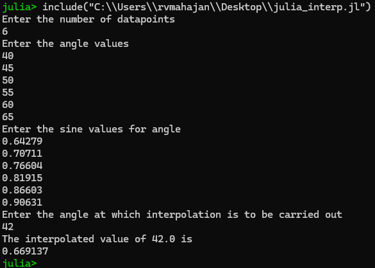 In Julia, we have used a package named DataInterpolations.jl and all complicated calculations are done by LagrangeInterpolation () function as can be seen from program.